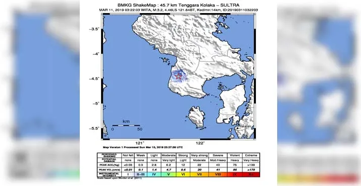 ZONASULTRA.COM, KENDARI – Gempa bumi tektonik dengan magnitudo 3,2 mengguncang wilayah tenggara Kabupaten Kolaka, Sulawesi Tenggara (Sultra) pada Senin (11/3/2019) pukul 03.22 Wita dini hari.