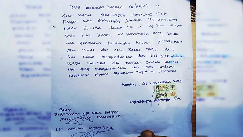 “Yang bertanda tangan di bawah ini atas nama KOMBES POL HARTOYO SIK dengan NRP 69080489 Jabatan DIR INTELKAM POLDA SULTRA dalam hal ini apabila sampai hari Kamis, 07 November 2019 belum ada penetapan tersangka kasus penembakan alm Yusuf dan Randi maka saya siap mengundurkan diri dari DIR INTELKAM POLDA SULTRA dan menolak jabatan apapun. Dan siap mengundurkan diri instansi Kepolisian Negara Republik Indonesia,” tulis Hartoyo.