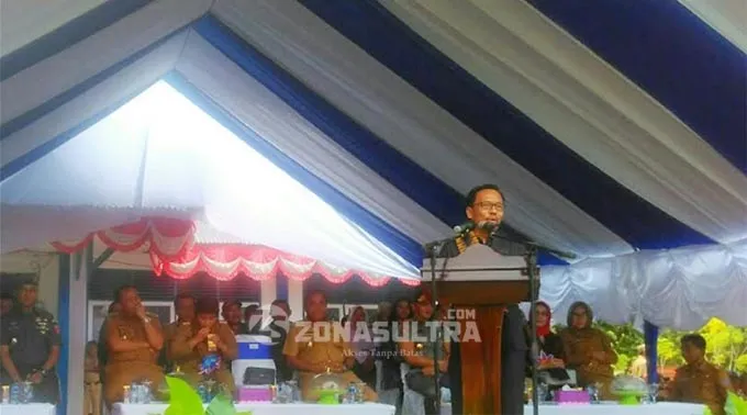 KUNJUNGAN KERJA – Direktorat Jemderal (Dirjen) Pembinaan Keuangan Daerah Kementerian Dalam Negeri (Kemendagri) Sarifuddin Udu saat memberikan sambutan kepada seluruh jajaran Satuan Kerja Perangkat Daerah (SKPD) dan seluruh Kepala desa Se-kabupaten Muna Barat terkait pengelolaan hutang keuangan daerah dan pengelolaan dana desa yang baik transparan dan akuntabel, Senin (8/1/2017).(Laode Pialo/ZONASULTRA.COM)