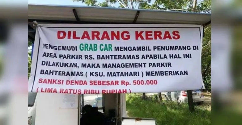 Spanduk yang terpasang di rumah sakit itu bertuliskan dilarang keras pengemudi Grab car mengambil penumpang di area parkir RS Bahteramas. Apabila dilakukan maka management parkir bahtermas KSU Matahari memberikan sanksi denda sebesar Rp500 ribu. (B)