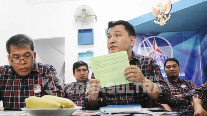 TIM KAMPANYE - Sejumlah Tim Kampanye dan Pemenangan pasangan calon walikota Derik-Syahriah di Sekretariat Demokrat Sultra, Kendari, Senin (10/10/2016). Tim yang diketuai Muhammad Endang tersebut mengecam adanya selebaran kampanye hitam yang menyerang Derik-Syahriah. (Muhamad Taslim Dalma/ZONASULTRA.COM)