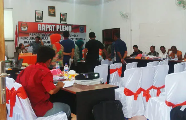 ZONASULTRA.COM, RAHA– Rapat pleno hasil perhitungan suara Pilbup Kabupaten Muna, Sulawesi Tenggara (Sultra), akhirnya rampung, Sabtu (19/12/2015) pukul 01.36 Wita. Pasangan Calon (Paslon) nomor urut 3, LM. Baharuddin-La Pili, menang dari rivalnya paslon nomor urut 1, LM. Rusman Emba-Malik Ditu, dengan keunggulan tipis hanya 33 suara.