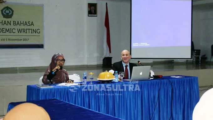 IAIN KENDARI - Unit Pelaksana Teknis (UPT) Pengembangan Bahasa IAIN Kendari menghadirkan Peter John Wanner, Guru Besar Tohoku University Jepang sebagai narasumber dalam pelatihan bahasa untuk penulisan karya ilmiah di Aula Perpustakaan IAIN Kendari, Sabtu (4/10/17). (Sri Rahayu/ZONASULTRA.COM)