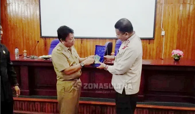 KUNJUNGAN KERJA - Sekretaris Kota (Sekot) Alamsyah Lotunani (baju cokelat) saat memberikan cinderamata sebagai kenang-kenangan kepada Ketua DPRD Kabupaten Seram Bagian Barat Julius M. Rotasouw. Rombongan anggota DPRD Kabupaten Seram Bagian Barat ini berkunjung ke Kendari, dalam rangka kunjungan kerja selama lima hari dari tanggal 11 sampai 15 Maret 2017. (RAMADHAN HAFID/ZONASULTRA.COM)