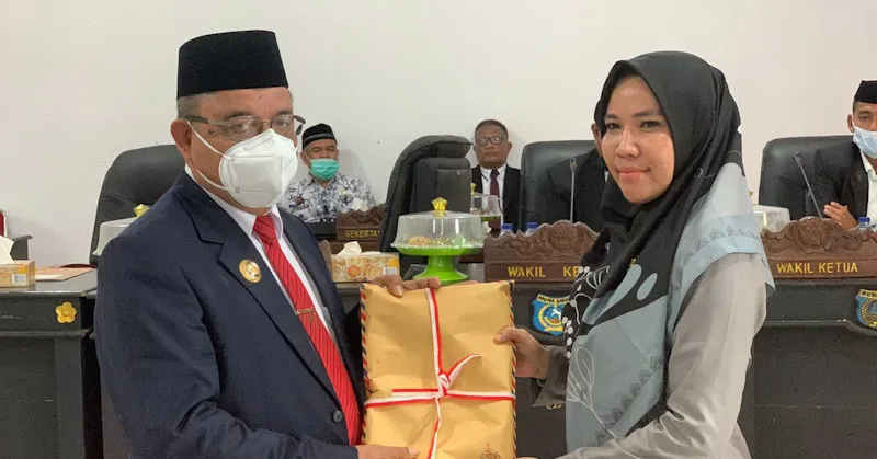 Bupati Mubar Achmad Lamani saat menyerahkan rancangan KUA-PPAS kepada Ketua DPRD Mubar Sitti Sariani Illaihi, yang dilaksanakan di gedung rapat paripurna DPRD, Kamis (25/11/2021). (Kasman/ZONASULTRA.COM).