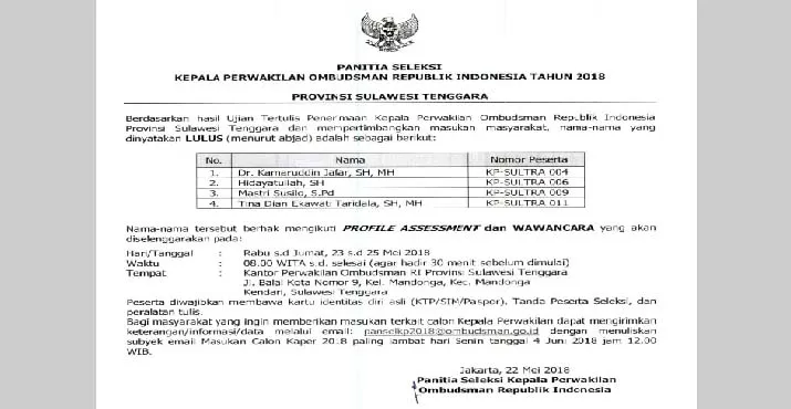 Psiko tes akan terlaksana pada Jumat 25 Mei di Kantor Perwakilan Ombudsman RI Provinsi Sulawesi Tenggara yang terletak di Jalan Balai Kota, Nomor 9, Kelurahan Mandonga, Kecamatan Mandonga, Kota Kendari.