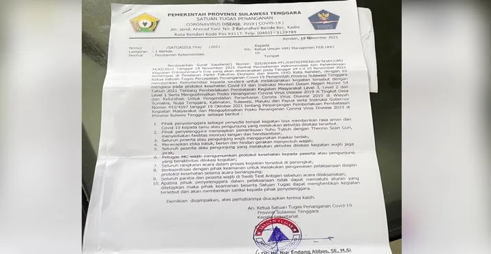 Ketua Panitia Enterpreneur’s Day FEB UHO, Husnal Shahid mengungkapkan bahwa penyelenggaraan kegiatan tersebut telah mengantongi izin dari Satuan Tugas (Satgas) Covid-19 Provinsi Sulawesi Tenggara (Sultra) yang ditandatangani langsung oleh Sekretaris Daerah (Sekda) Sultra, Nur Endang Abbas selaku ketua Satgas Covid-19 Provinsi Sultra.