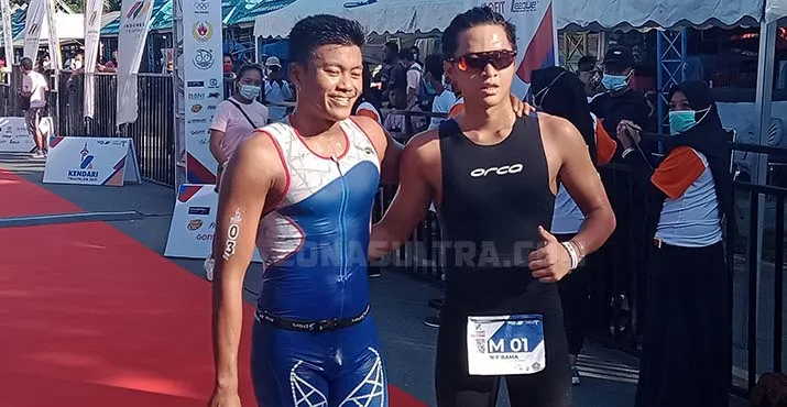 Pria asal Jawa Timur (Jatim) ini sukses menyentuh garis finish setelah menuntaskan renang 750 meter, balap sepeda 20 kilometer dan lari 5 kilometer dan finish dengan waktu 01 jam 00 menit 44 detik.