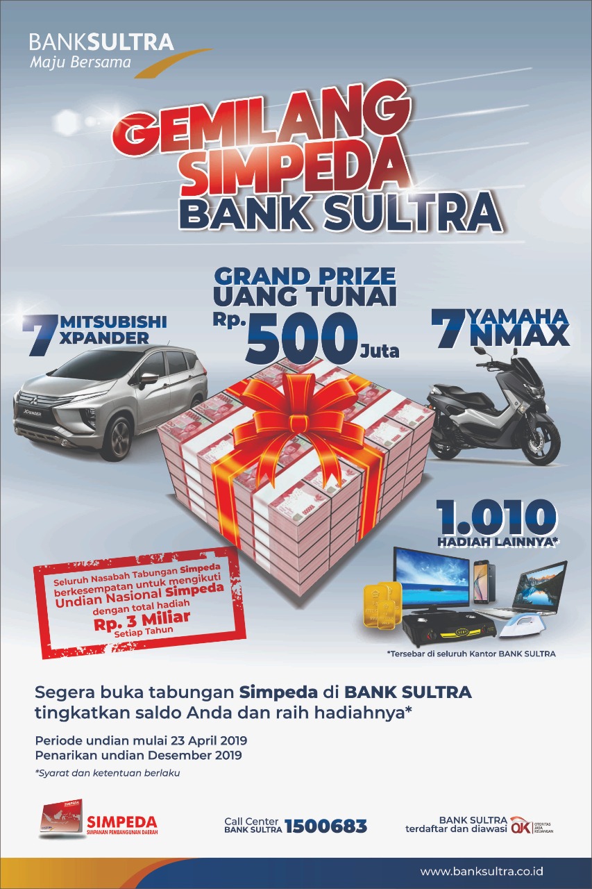 Selain berpeluang mendapatkan hadiah senilai miliaran rupiah pada undian Gemilang Simpeda Bank Sultra, nasabah Simpeda Bank Sultra juga diikutkan pada undian nasional Simpeda yang diundi sekali setahun dengan total hadiah Rp. 3 miliar.