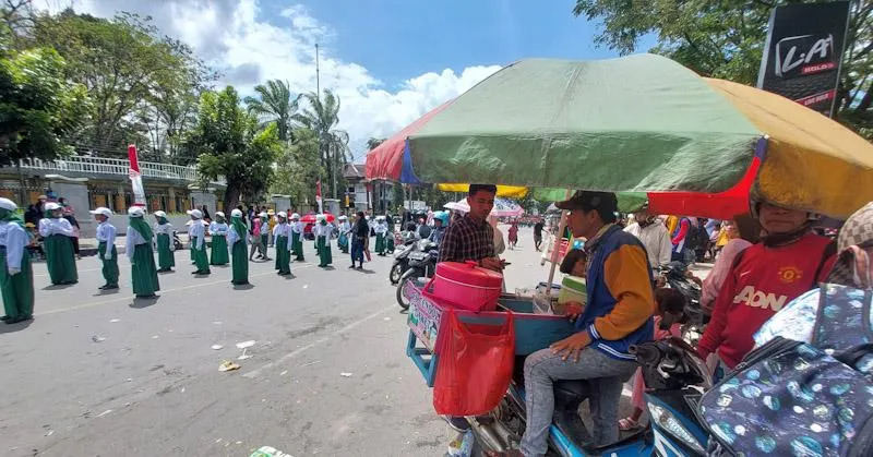 ZONASULTRA.ID, KENDARI – Pelaksanaan gerak jalan tingkat SD dan SMP di Kota Kendari, Sulawesi Tenggara (Sultra) dalam rangka menyambut Hari Ulang Tahun (HUT) ke-78 RI pada Senin (14/8/2023) menguntungkan para pedagang.