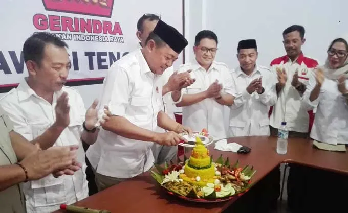 HUT GERINDRA - Ketua DPD Partai Gerindra Imran, saat melakukan pemotongan tumpeng nasi. Dalam HUT Gerindra tahun ini mantan Bupati Konsel dua periode ini berharap partai Gerindra harus menjadi panutan, dengan menunjukkan kedewasaan didalam berpolitik. (RAMADHAN HAFID/ZONASULTRA.COM)