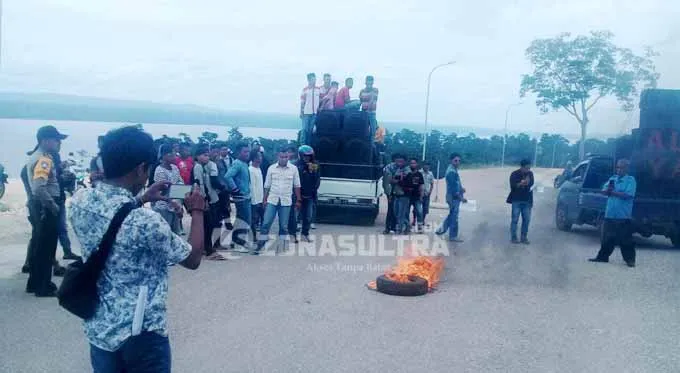DEMO - Terlihat puluhan para demonstran saat melakukan aksi dihadapan kantor Bupati Buton, sambil membakar ban sebagai tanda kekesalan mereka terhadap birokrasi yang ada saat ini, Senin (22/1/2018). (NANANG SUPARMAN/ZONASULTRA.COM)