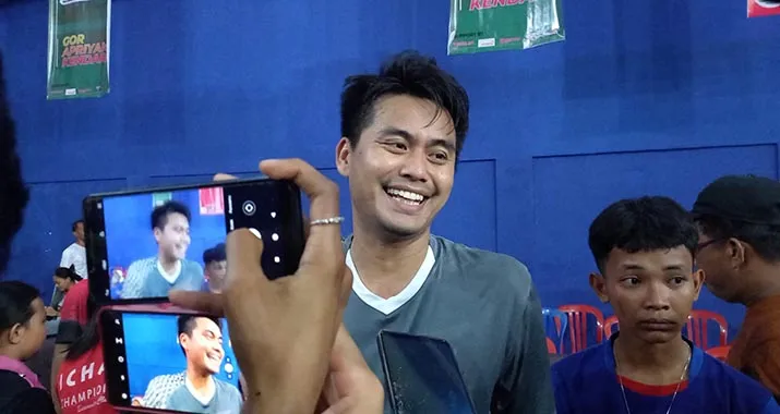 Tontowi Ahmad usai melakukan pertandingan persahabatan dalam Festival Bulu Tangkis Kendari di GOR Apriyani Rahayu (Bima/ZONASULTRA.ID)