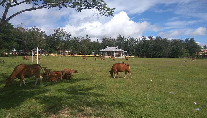 Halaman yang luas dengan rumput yang tumbuh subur di area halaman perkantoran menjadi salah satu alasan warga sekitar berdatangan membawa sapi-sapi mereka untuk diberi makan.