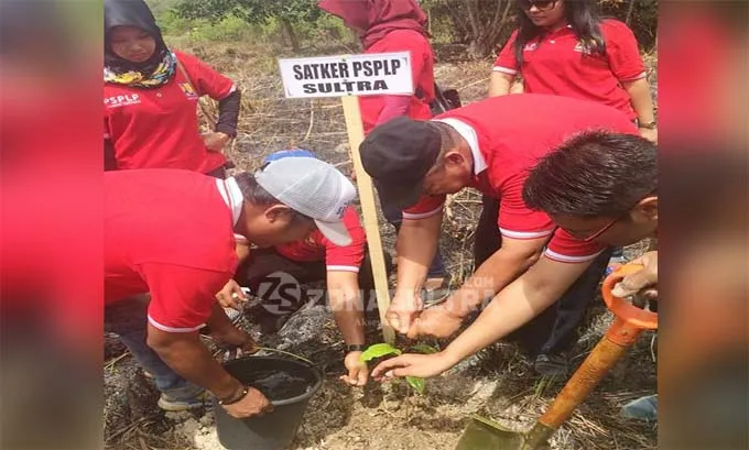 PENANAMAN POHON – Kementerian PUPR melakukan penanaman 1.00 pohon di seputaran danau Anggotoa, Kabupaten Konsel, provinsi Sultra, Selasa (28/11/2017). Kegiatan ini merupakan rangkaian gerakan peduli mitigasi bencana yang diprogramkan kementerian tersebut. (M Rasman Saputra/ZONASULTRA.COM)