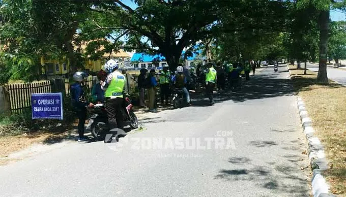 OPERASI ZEBRA – Satuan Lalulintas Polres Muna menggelar Operasi Zebra Anoa 2017 di Jalan Baypas, Kelurahan Wamponiki, Kecamatan Katobu, Kabupaten Muna, Rabu (1/11/2017). (Kasman/ZONASULTRA.COM).