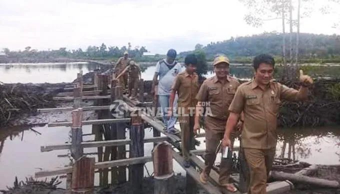 PENINJAUAN TAMBAK - Kepala Dinas Kelautan dan Prikanan (DKP) Konawe Utara, Dedi Rianto bersama Kepala Bidang (Kabid) Tangkap Prikanan Konut, Asrianto Adam serta jajarannya saat melakukan peninjuaan pembuata tambak ikan para nelayan. (Jefri/ZONASULTRA.COM).