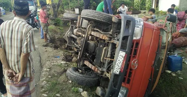 Truk yang memuat penuh aneka sayuran tersebut terbalik setelah menghindari rusak dan berlubang di ruas jalan Pakue. Beruntung Dandi sang pengemudi dan dua rekanya, tidak mengalami cidera parah, namun muatan truk berupa aneka sayuran berhamburan. Arus lalu lintas di ruas jalan juga sempat terhenti beberapa saat.