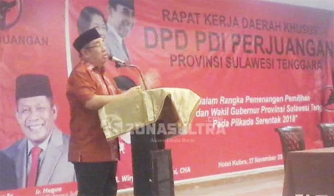 PILGUB SULTRA – Asrun memberikan sambutan pada pembukaan Rapat Kerja Daerah Khusus PDIP di salah satu hotel Kendari, Senin (27/11/2017). Asrun optimis dapat memenangkan pemilihan gubernur bersama PDIP. (Muhamad Taslim Dalma/ZONASULTRA.COM).