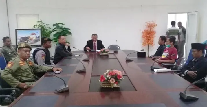 DEMONSTRASI - Buton Buton, Laode Zilfar Djafar saat berdialog dengan perwakilan demonstran di aula kantor Bupati Buton Takawa terkait persoalan aksi unjuk rasa yang dilakukan HMI Pasarwajo, Kamis (16/8/2018). (Nanang/ZONASULTRA.COM)