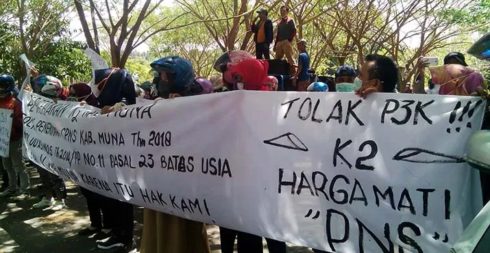 ZONASULTRA.COM,RAHA-Seleksi CPNS 2018 dianggap tidak pro honorer K2. Alih-alih diangkat langsung, mereka justru harus ikut berebut jatah CPNS formasi K2 lewat tes, yang kursinya sangat terbatas. Di Muna, mekanisme ini diprotes. Lebih dari 100 orang yang mengaku sebagai honorer K2 menggelar unjuk rasa, menolak seleksi CPNS 2018 yang dianggap merugikan mereka.