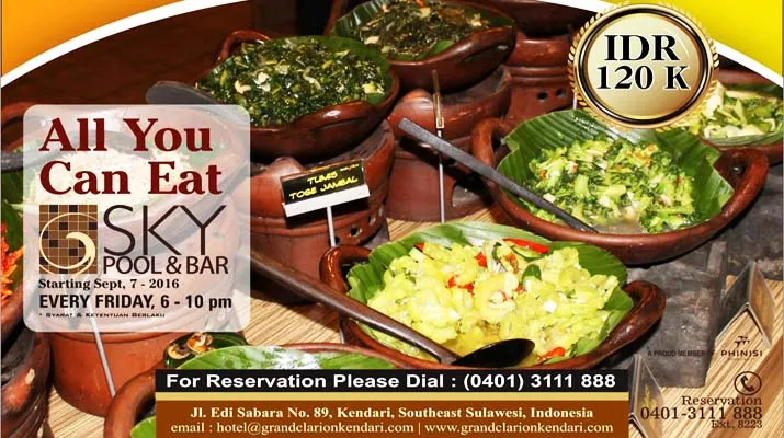 Sundanese Street Food ini hadir di Sky Pool and Bar lantai dua Grand Clarion Hotel Kendari setiap hari Jumat, pada pukul 18.00 – 22.00 Wita. Harganya pun cukup terjangkau, dengan harga Rp. 120.000 nett Anda sudah bisa mendapatkan berbagai menu makanan Sunda.