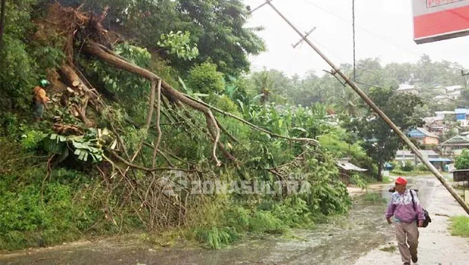 ZONASULTRA.COM, KENDARI – Hujan deras yang kembali mengguyur Kota Kendari, Sulawesi Tenggara (Sultra) sejak Sabtu (13/5/2017) kemarin, tidak hanya menyebabkan banjir di sejumlah wilayah di Kota Kendari. Sebuah pohon tumbang menimpa tiang listrik di Jalan Jenderal Sudirman, Kelurahan Kandai, Kecamatan Kendari, Minggu (14/5/2017).