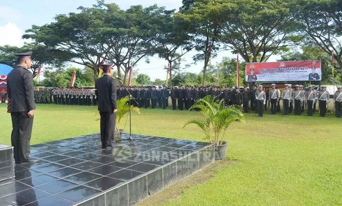 HUT BHAYANGKARA – Upacara perayaan Hari Ulang Tahun (HUT) Bhayangkara ke-71 digelar Polres Konawe, Sulawesi tenggara (Sultra) di halaman Mako Polres Konawe, Sulawesi Tenggara (Sultra) pada hari Senin (10/7 2017), berlangsung secara sederhana. (Dedi Finafiskar/ZONASULTRA.COM)