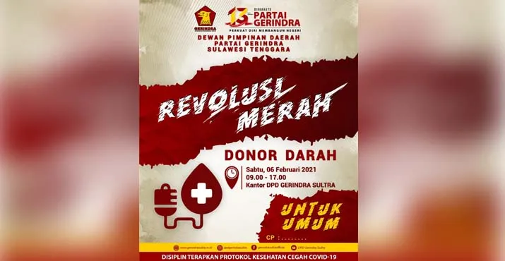 ZONASULTRA.COM, KENDARI – Dalam rangka Hari Ulang Tahun (HUT) Partai Gerakan Indonesia Raya (Gerindra) yang ke-XIII pada 6 Februari 2021, Dewan Pimpinan Daerah (DPD) Partai Gerindra Provinsi Sulawesi Tenggara (Sultra) bakal mengadakan Revolusi Merah.