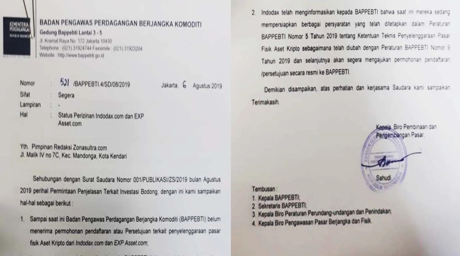 Dalam surat itu, Sahudi menyebutkan dua poin penting bahwa hingga saat ini pihaknya belum menerima permohonan pendaftaran atau persetujuan terkait penyelenggaraan pasar fisik aset kripto dari Indodax.com dan EXP Asset.com.