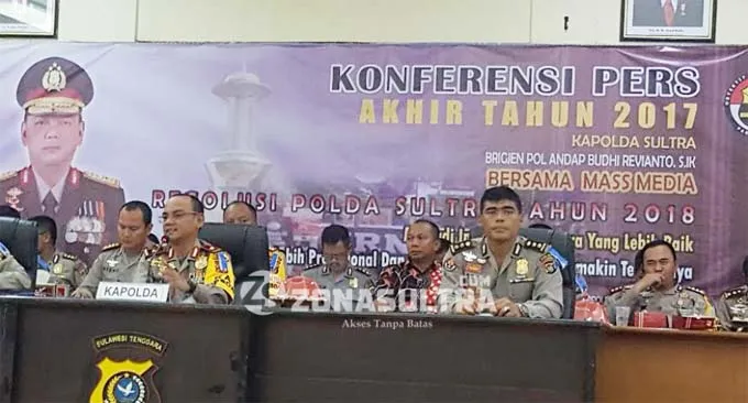 ZONASULTRA.COM, KENDARI – Kepala Kepolisian Daerah Sulawesi Tenggara Brigjend Pol Andap Budhi Revianto menggelar konferensi pers akhir tahun 2017 di Aula Dhacara Polda Sultra, Jumat (29/12/2017).