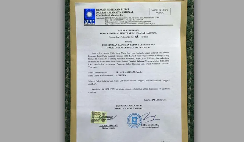 Pada SK yang ditandatangani itu tertera stempel basah DPP PAN plus materai 6.000. Di dalam SK itu, DPP PAN memberikan persetujuan pasangan calon gubernur dan wakil gubernur Sultra atas nama calon gubernur Asrun dan calon wakil gubernur Hugua.