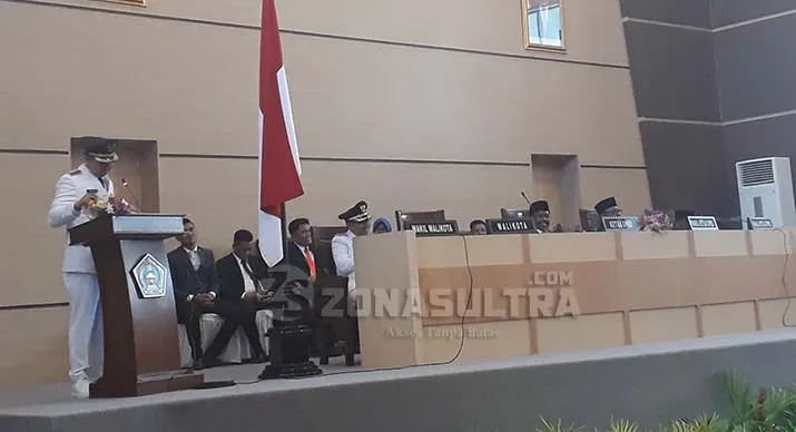 PIDATO PERTAMA – Walikota Kendari yang baru saja dilantik Adriatma Dwi Putra menyampaikan pidato pertamanya dalam sidang paripurna istimewa di kantor DPRD Kota Kendari. (M Rasman Saputra/ZONASULTRA.COM)