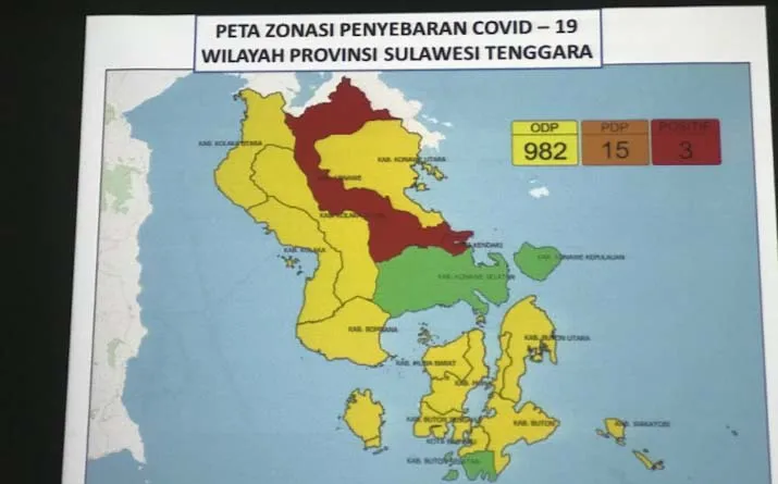 Dari sebaran ini ada dua daerah yang masuk dalam zona merah yakni Kendari dan Konawe, karena terdapat 3 kasus positif. Daerah dengan terlapor ODP masuk dalam zona kuning sedangkan tiga kabupaten belum ada terlapor masuk zona hijau. Kemudian dijelaskan bahwa udpate data jumlah ODP ini akan diperbaharui setiap 12 jam setiap pukul 20.00 WITA. (a)