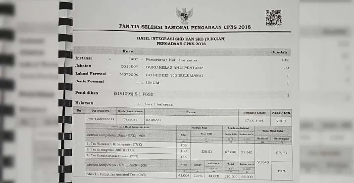 Rincian nilai yang diraih Satriani yang menyandang jabatan PGSD ahli pertama ini mampu melambung 117 peserta yang lulus pada Seleksi CPNS tahun 2018 di Kabupaten Bombana. Perolehan nilai dari wanita kelahiran 7 September 1984 ini didominasi oleh tingginya nilai tes pada SKD dan SKB plus sertifikat pendidik dan berstatus putera-puteri daerah.