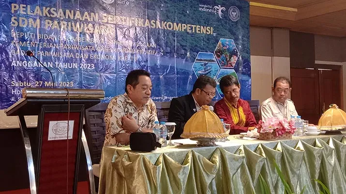 ZONASULTRA.ID KENDARI– Deputi Bidang Sumber Daya dan Kelembagaan Kementerian Pariwisata dan Ekonomi Kreatif (Kemenparekraf) Badan Pariwisata dan Ekonomi Kreatif bersama Ikatan Pemandu Museum Indonesia (IPMI), Lembaga Sertifikasi Profesi (LSP) Pramu Wisata Indonesia (Pramindo), Bank Dunia sebagai Funding (Pendanaan) dan Jurusan Pendidikan Bahasa Inggris FKIP UHO menggelar sertifikasi kompetensi, di salah satu hotel di Kendari, Sabtu (27/5/2023).