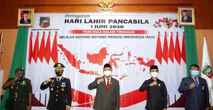 HARI PANCASILA-Bupati Konut, Ruksamin bersama Ketua DPRD Konut, Kapolres Konut, Sekda Konut saat mempimpin upacara Hari Lahirnya Pancasila di Posko Utama Covid-19 Konut di Aula Dinas Kesehatan Konut.(Jefri/ZONASULTRA.COM)