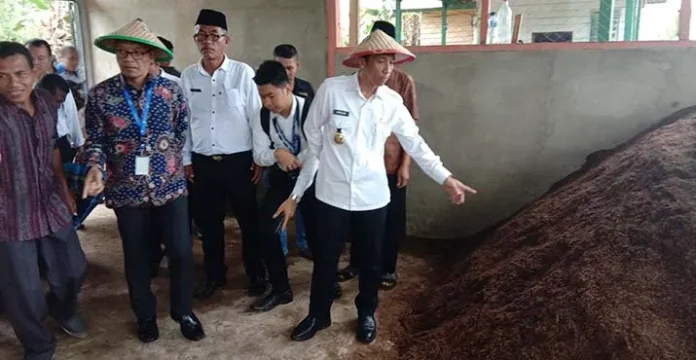 DESA AUNUPE - Wakil Bupati Konsel Arsalim Arifin dan Kepala Perwakilan Bank Indonesia Provinsi Sulawesi Tenggara (Sultra) Minot Purwahono Serta Kepala Desa Aunupe saat melihat tempat permentasi pupuk yang terbuat dari kotoran ternak petani. Hal inilah yang dijadikan para petani di Aunupe dalam bercocok tanam. Rabu (5/9/2018). (ZONASULTRA. COM/ERIK ARI PRABOWO)