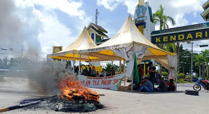 ZONASULTRA.COM, KENDARI – Jelang kedatangan gelombang pertama 156 tenaga kerja asing (TKA) asal Tiongkok, puluhan mahasiswa Institut Agama Islam Negeri (IAIN) Kendari memblokade gerbang masuk Kota Kendari di Kecamatan Ranomeeto, Senin (22/6/2020).
