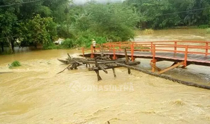 ZONASULTRA. COM, WANGGUDU – Jembatan penghubung tiga desa yakni, Desa Puuwona, Laronanga dan Puusuli yang berada di Kecamatan Andowia, Kabupaten Konawe Utara (Konut), Sulawesi Tenggara (Sultra) hancur akibat diterjang arus sungai. Akibatnya akses jalan di tiga desa tersebut putus total.