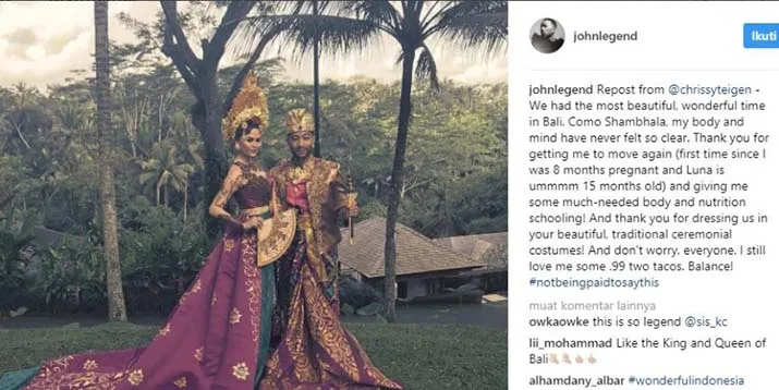 John Legend tak hanya memamerkan fotonya saat belibur di Bali. Dia dan Chrissy juga mengenakan baju khas Bali lengkap dengan kerisnya.