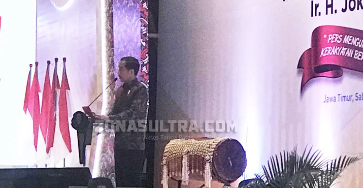 PERINGATAN HPN : Presiden Jokowi memberikan sambutan pada puncak acara Hari Pers Nasional (HPN) di gedung Grand City, Surabaya, Jawa Timur (Jatim), Sabtu (9/2/2019). Jokowi mengapresiasi tingkat kepercayaan publik terhadap media konvensional dibandingkan media sosial (Medsos). (FOTO RUSTAM/ZONASULTRA.COM)