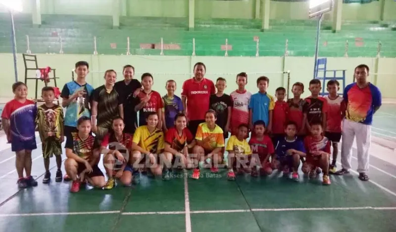 BULUTANGKIS – Pembina, pelatih dan atlet Clup PB KME PBSl Konut berfoto bersama usai latihan teknik bermain bulutangkis di GOR lapangan Badminton Konawe, Senin (20/11/2017). (Jefri/ZONASULTRA.COM)