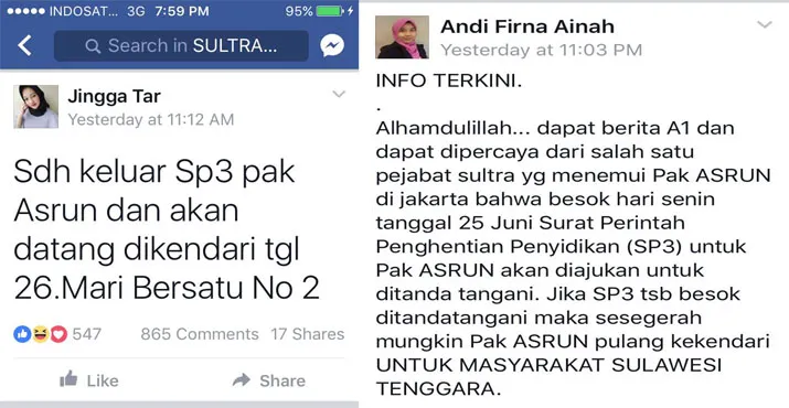 Seperti pemilik akun facebook Andi Firna Ainah yang menuliskan “Info terkini: Alhamdulillah dapat berita A1 dan dapat dipercaya dari salah satu pejabat Sultra yg menemui Pak Asrun di Jakarta bahwa besok hari senin tanggal 25 Juni Surat Perintah Penghentian Penyidikan (SP3) untuk Pak Asrun akan diajukan untuk ditanda tangani. Jika SP3 tsb besok ditandatangani maka sesegerah mungkin Pak Asrun pulang ke Kendari UNTUK MASYARAKAT SULAWESI TENGGARA”