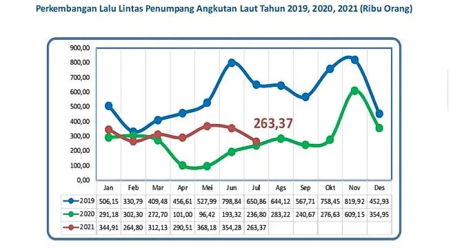 Sedangkan untuk angkutan laut jumlah penumpangnya dalam negeri pada Juli 2021 tercatat 263.367 orang atau mengalami penurunan sebanyak 25,66 persen dibanding bulan sebelumnya yang tercatat sebanyak 354.277 orang. Namun, mengalami peningkatan sebesar 11,22 persen jika dibandingkan dengan tahun sebelumnya (Juli 2020) yang tercatat sebanyak 326.802 orang.