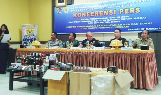 “Jadi hasil tembakau dengan barang bukti 40.642.947 batang yang berpotensi meruginakan negara itu senilai Rp.10.770.386.255 milliar, sedangkan miras dengan barang bukti 59.913 botol sebesar Rp.10.278.248.626 milliar. Seluruh jumlah penindakan yang kami lakukan selama 2015 lalu sebanyak 385 kali penindakan, hal ini meningkat 1.6 kali lipat dibanding 2014 yang mencapai 241 penindakan” tuturnya.