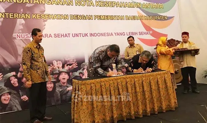 PENANDATANGANAN - Kery Konggoasa saat menandatangani Nota Kesepahaman Antara Kemenkes Dengan Pemerintah Daerah Kabupaten di Hotel Royal Kuningan, Jakarta Selatan, Senin (8/5/2017). (Rizki Arifiani/ZONASULTRA.COM)