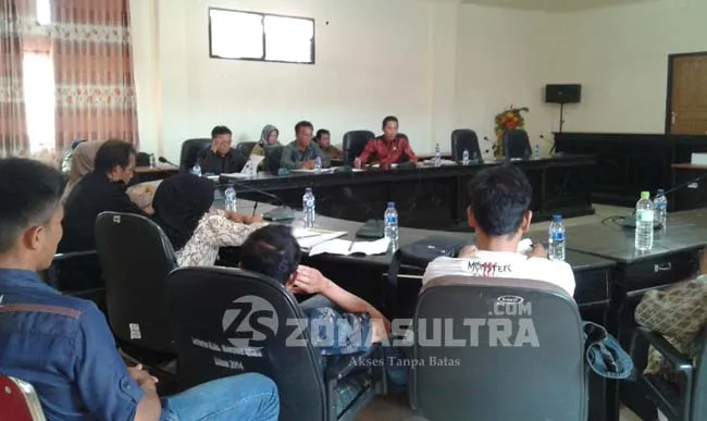 Masyarakat dan aparat desa Longeo, saat menggelar hearing rapat dengar pendapat (RDP) di aula pertemuan kantor Dewan Perwakilan Rakyat Daerah (DPRD) Konut, Senin, (19/9/2016) yang dipimipin ketua komisi A DPRD Konut, Rasmin Kamil, bersama anggota Komisi A. Foto : Jefri Ibnu/ZONASULTRA.COM