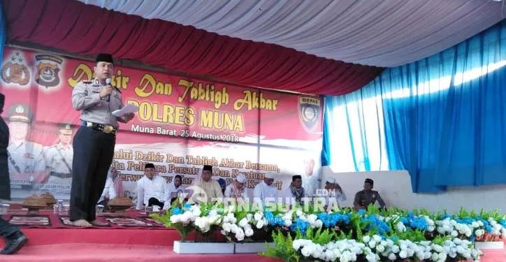 ZONASULTRA.COM, LAWORO – Kepolisian Resort (Polres) Muna menggelar Dzikir dan Tabligh Akbar di Lapangan Desa Mekar Jaya, Kecamatan Tiworo Tengah, Kabupaten Muna Barat, Sulawesi Tenggara (Sultra), Sabtu (25/8/2018). Kegiatan ini untuk mewujudkan kamtibmas yang kondusif di wilayah hukum Polres Muna.