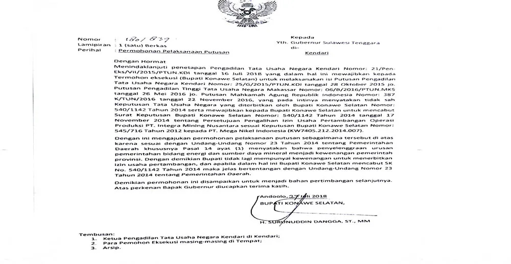 Sebelumnya, Bupati Konsel Surunuddin Dangga telah bersurat ke Gubernur Sultra perihal permohonan pelaksanaan putusan tanggal 27 Juli 2018. Hal ini sesuai Undang-undang nomor 23 tahun 2014 tentang Pemerintahan Daerah (Pemda) khususnya pasal 14 ayat (1) yang menyatakan bahwa penyelenggaraan urusan pemerintahan bidang energi dan sumberdaya mineral menjadi kewajiban provinsi. (B)